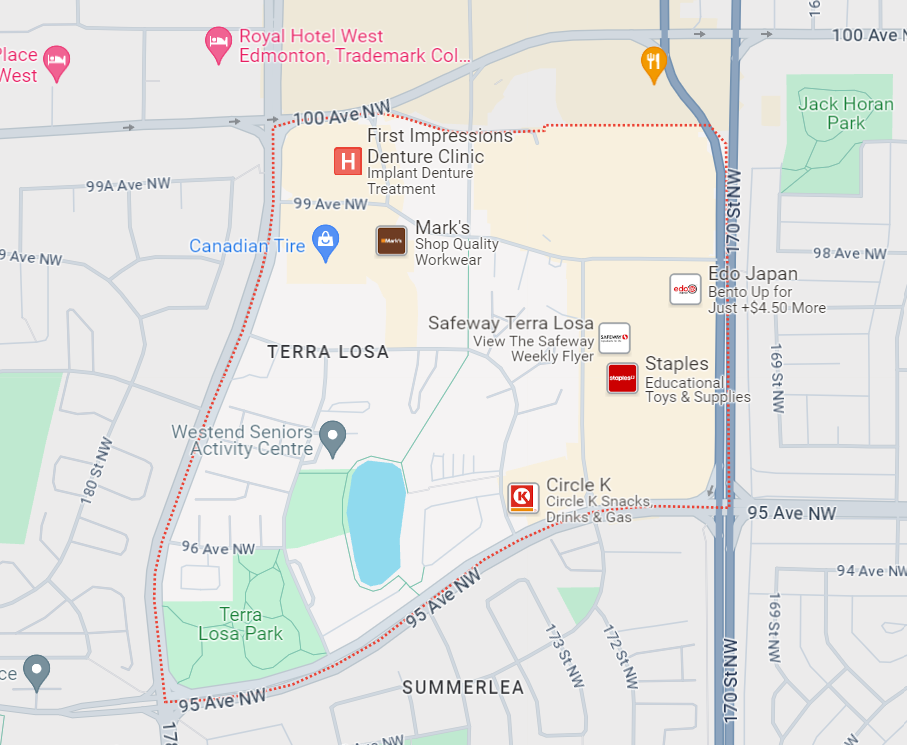 Terra Losa is bounded by 170 Street on the east, 178 Street on the west, 95 Avenue on the south, and 99A/ 100 Avenue on the north.