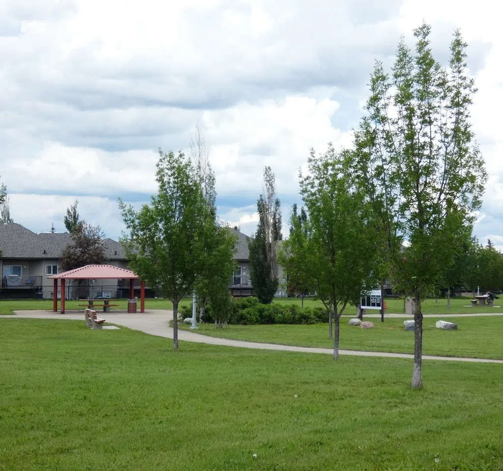 Frank and Etta Wild Park honour two beloved community members who championed public green spaces. The park features open lawns, walking paths, and shaded seating areas, making it a great place for quiet reflection, recreation, and neighbourhood gatherings.